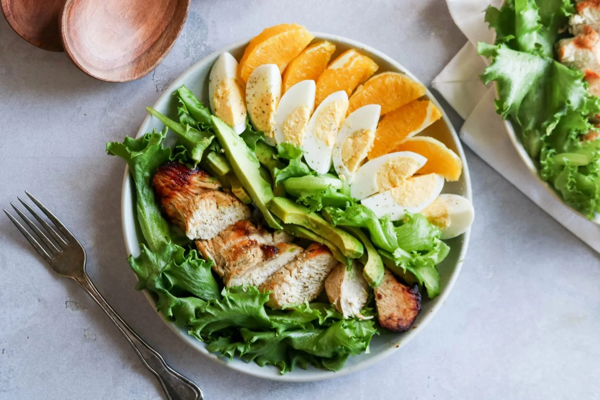 Dans deux assiettes, répartir la laitue, les suprêmes d’orange, le poulet, l’avocat et les œufs.